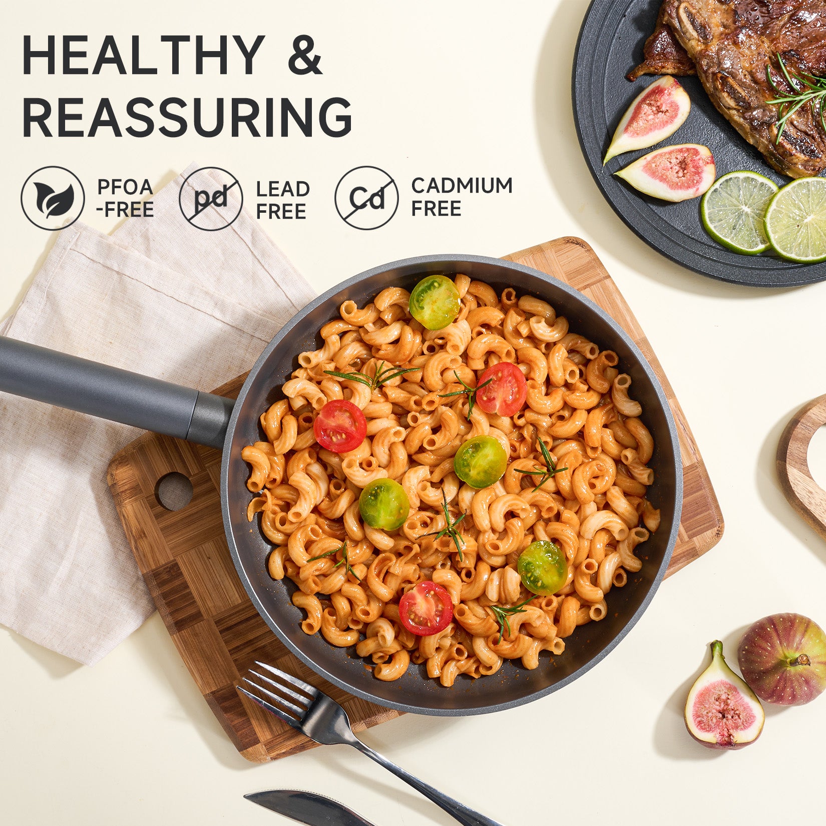 Granite stoneware pans are considered as the most healthy and secure cookware available on the market, Carote granite-Coated cookware doesn’t contain harmful chemicals that might affect our health, 100% free of PFOS, PFOA, certified by FDA, SGS, MA, CNAS.